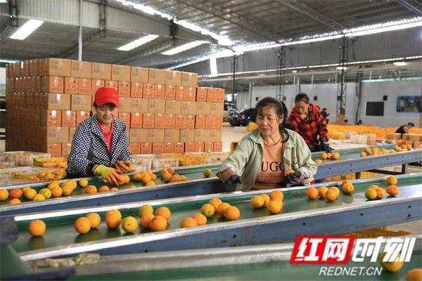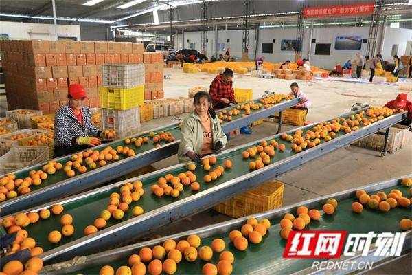 在粗石江鎮雲霧山專業合作社裡,數十名工人正忙著對剛從果園裡采摘回來的夏橙進行清洗、分級、裝箱,一片忙碌景象。據合作社負責人何輝介紹,江永的夏橙經歷一年時間的“三青三黃”的循環生長過程,口感七分甜三分酸,當前非常受消費者歡迎。