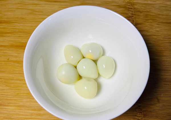 步驟:1、鵪鶉蛋放入鍋中,開中火煮6分鐘左右。煮好後撈出,放在冷水中浸泡降溫,剝去蛋殼後放在一旁備用。