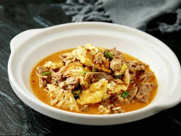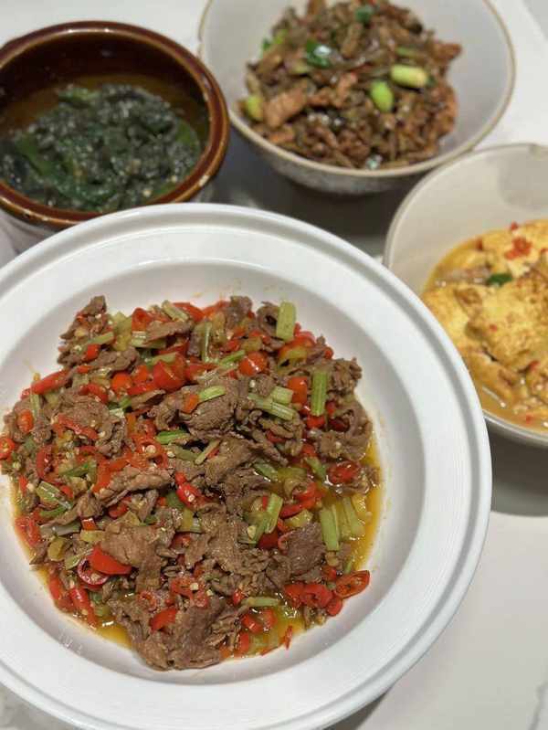 尖椒荷包蛋是典型的湖南傢常菜,青紅辣椒把煎過的雞蛋再進行翻炒,同樣下飯。煙筍臘肉、小炒黃牛肉、小炒豬腳皮、攸縣炒香幹這些傢喻戶曉的湖南菜都在這裡吃到地道口味和鄰傢親切感。