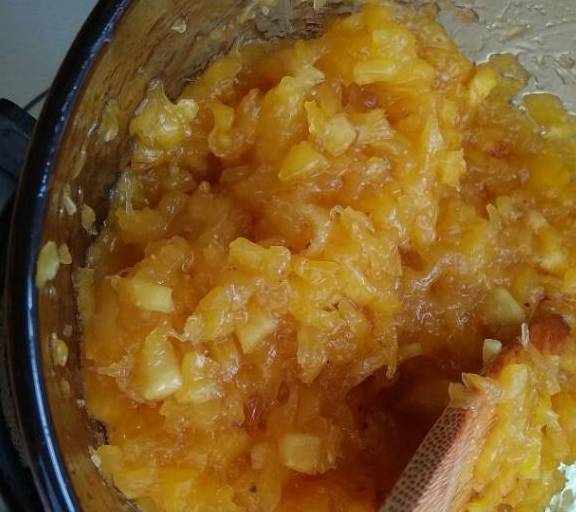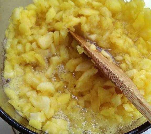 第4步、醃好的菠蘿倒在鍋裡熬煮。
