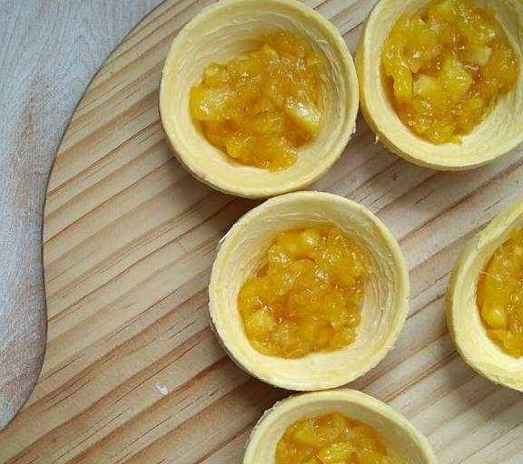 第7步、蛋撻皮裡放入適量的菠蘿餡兒。