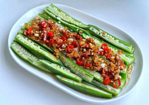 食材清單:秋葵200克,蒜粒40克,小米辣15克,生抽16克,蒸魚鼓油8克,植物油適量