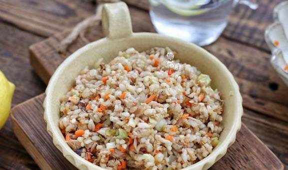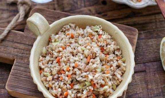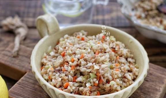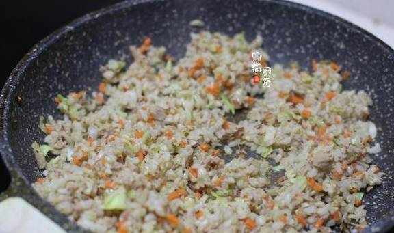5.可以加少許胡蘿卜粒,既補充更多維生素還能增加一些鮮艷的顏色。最後把煮熟的糙米飯倒入鍋中,快速翻拌均勻即可。