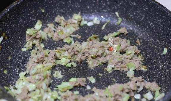 4.熱鍋後倒入少許橄欖油,把金槍魚和包菜碎炒熟。