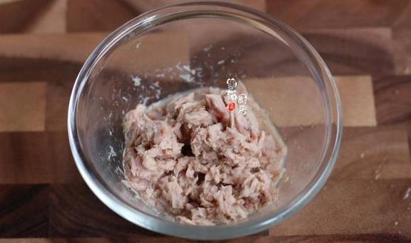 2.準備一些鹽漬金槍魚,金槍魚是一種海產做成的罐頭,肉質疏松,同時也有淡淡的咸味,可以替代部分調味的食鹽。