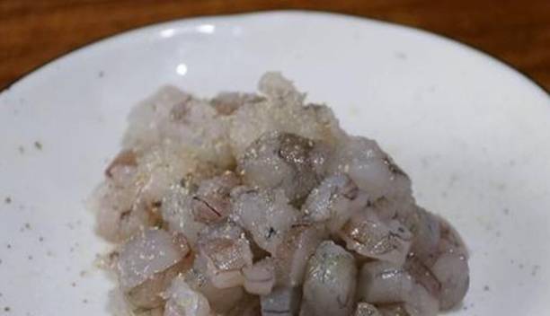剝好的蝦然後再切成小塊,把切好的蝦塊放在盤子裡面,然後給蝦進行醃制。我們先放一些的調味料去腥,然後再加入適量的鹽,在加入胡椒粉提味,接著把切好的韭菜切成碎,放在大盆裡面,這時候先別放鹽,因為韭菜遇到鹽會出水。