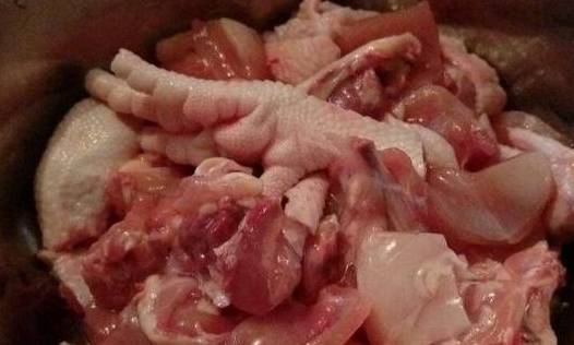 我們應該要把雞先處理好,去掉雞毛和雞內臟等一些不能夠吃的部位,然後剁成小塊兒放在清水裡來進行清洗幹凈,用溫水進行浸泡,再放入一勺料酒和一勺白醋,差不多半個小時左右充分的浸泡出血水。