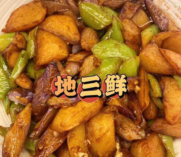4、鍋中熱油,下入一把熗鍋蒜,倒入醬汁,煮至完全冒泡後依次倒入土豆、茄子、青椒,翻炒均勻後加入一把出鍋蒜即可
