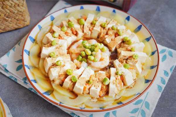 準備食材:吊瓜1根,蝦仁8隻,豆腐400克,肉糜200克,胡蘿卜半根,雞蛋1個,豌豆粒30克,蔥薑料酒5毫升,松茸醬油30毫升,鹽3克,芝麻香油15毫升