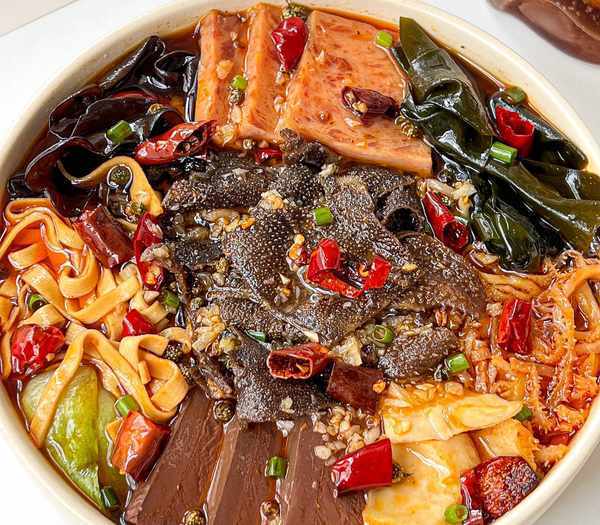 3、湯汁分別煮熟蔬菜和葷菜,煮熟後撈出放入碗中澆湯汁,表面放蔥蒜、花椒和幹辣椒,淋入熱油激出香味即可。