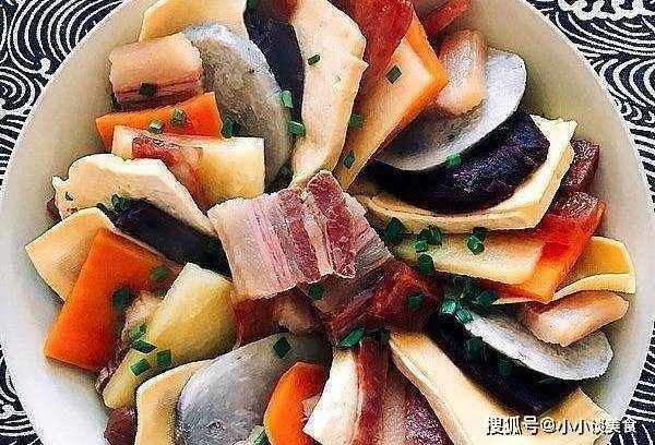 原料:松桂坊臘肉500克、荔浦芋頭100克、土豆1個、紫薯1個、南瓜100克、木棉豆腐半塊、生抽適量、料酒適量、白糖少許、小蔥4根;