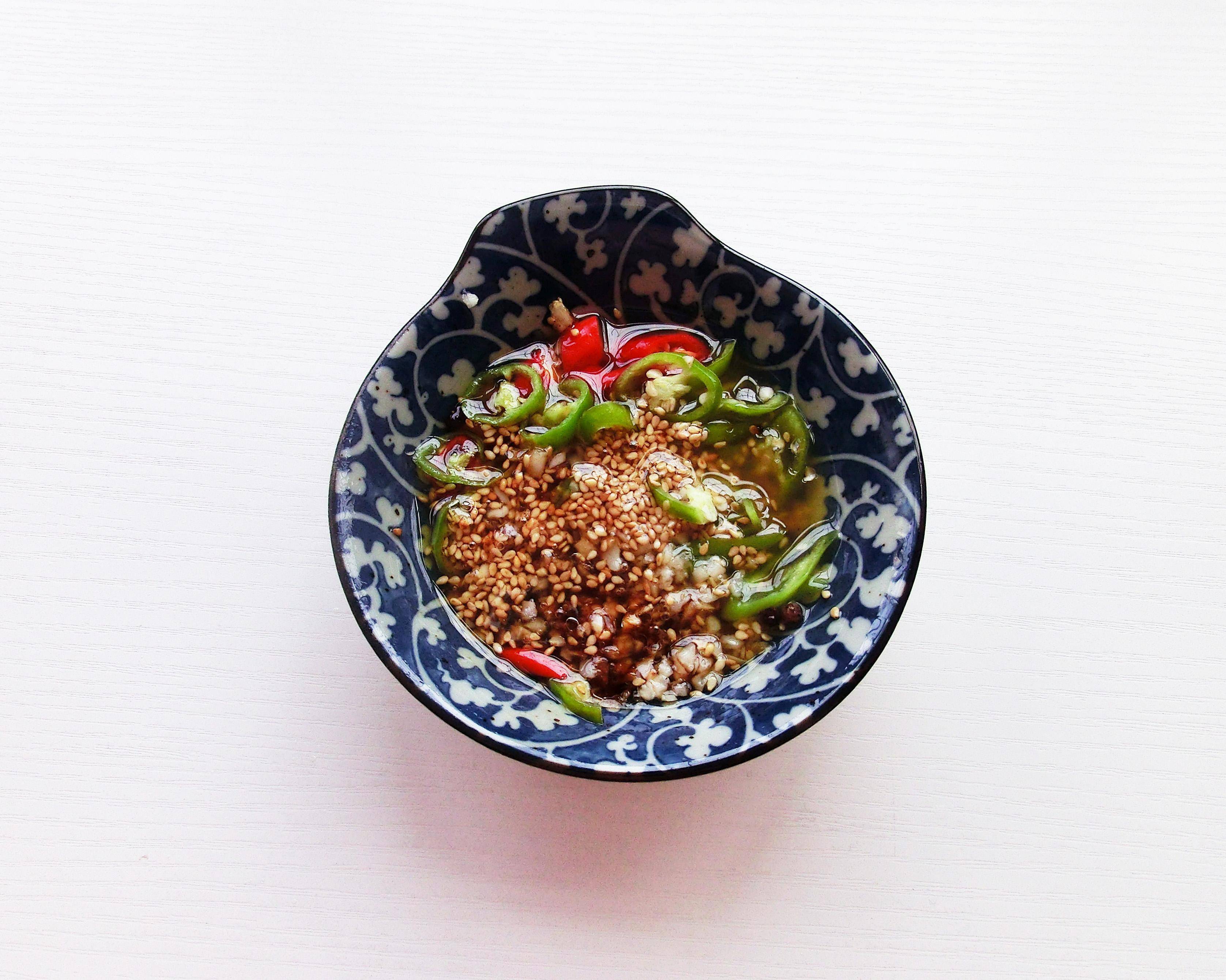 食材:蒜末20克,小米椒2個,線椒2個,芝麻10克,糖3克,生抽20克,醋15克,蠔油10克,青花椒3克,花椒3克。