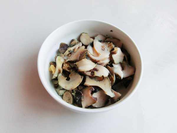 4. 取出螺肉,去掉內臟。海螺後部螺旋並顏色發黑的部分即為內臟。
