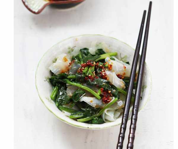 7.將菠菜、粉皮放入大碗中,倒入料汁,拌勻即可。