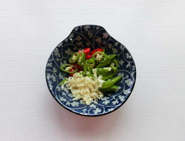 做法:1.小米椒、線椒切圈,蒜切末放入碗中