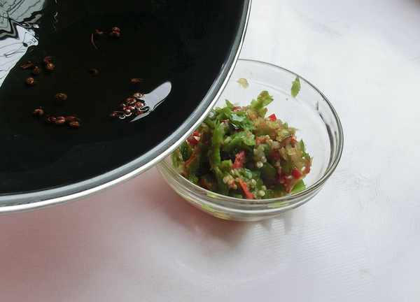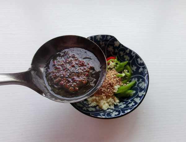 3.用青花椒、花椒炸一勺油,倒入碗中