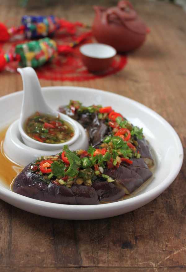 做法:1. 將茄子洗凈去蒂,切菱型花刀,上鍋蒸至茄子軟爛取出,潷水晾涼,撕成條裝盤;