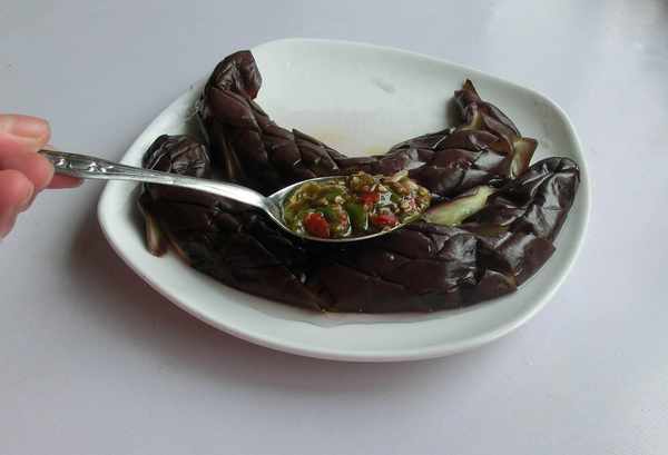 食材:茄子500克、小米椒2個、線椒3個、大蒜(白皮)6瓣、香菜少量