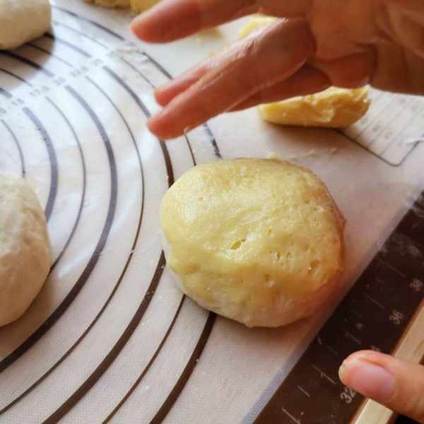 第三步:拿出麵團,排氣後分成等份的麵團,蓋上保鮮膜,我們開始製作鳳梨包的酥皮。