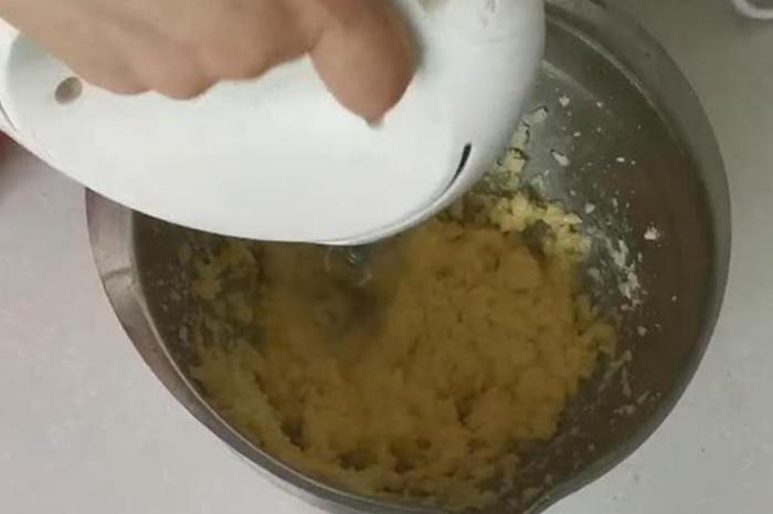 第四步:先把黃油室溫融化,加入白糖用打蛋器打發,然後分次加入蛋液打發,篩入奶粉和麵粉拌勻,放入裱花袋。