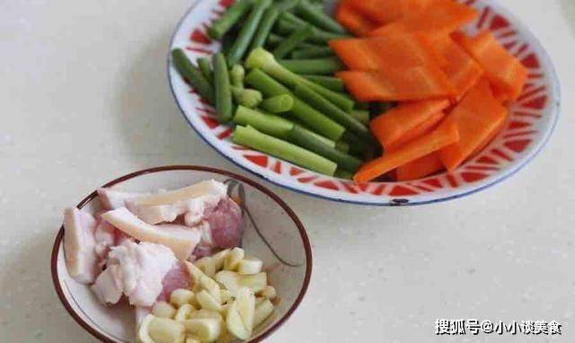 1、胡蘿卜切片,蒜苔切片,五花肉切片,大蒜切片。