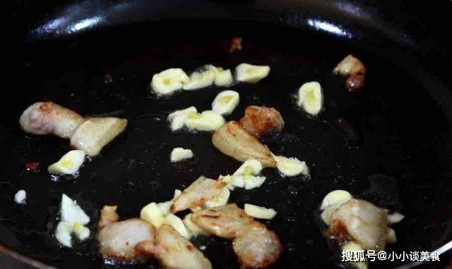 2.鍋裡不要放油,將五花肉翻炒去油,然後加入切好的蒜片。