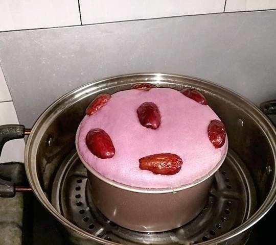 9、鍋中倒入適量的清水,將發糕放入鍋中,大火燒開後,改成中火蒸25分鐘,關火後燜3分鐘就可以出鍋瞭。