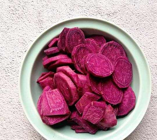 1、將所有的材料準備好,紫薯去掉外皮之後用刀切成片。鍋中倒入適量的清水,將切好的紫薯放入鍋中蒸熟。
