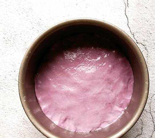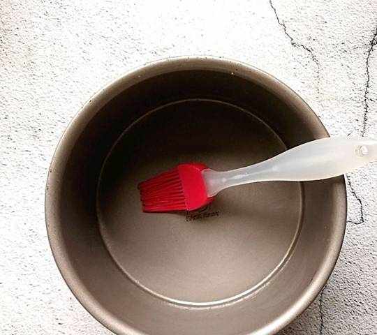 6、取一個6寸大小的模具,刷一層玉米油。如果傢中沒有模樣可以用盆子或大碗代替,刷一層油是為瞭更好的脫模。