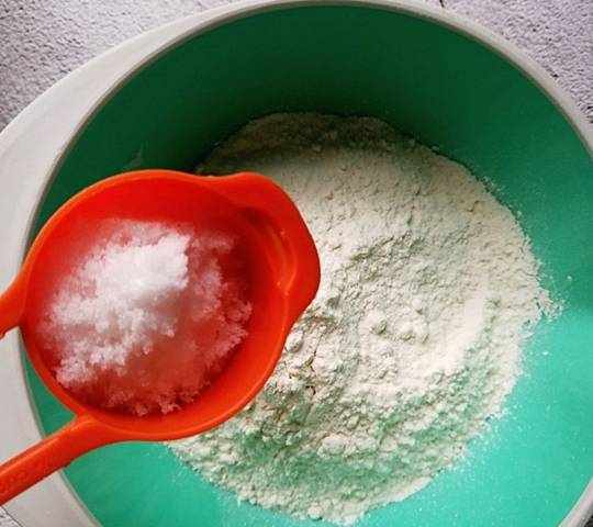 4、準備一個盆,倒入面粉和細砂糖。