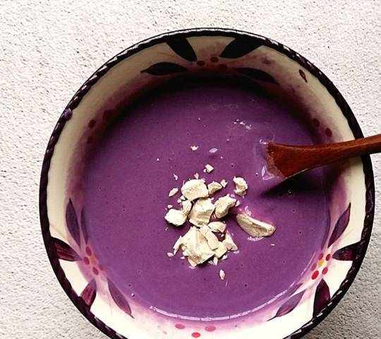 2、蒸熟的紫薯晾涼後稱出210g和牛奶一起倒入料理機中打成紫薯牛奶泥。