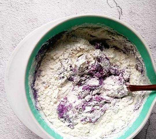 5、將紫薯牛奶酵母液倒入到面粉中,攪拌均勻,一直攪拌到看不見幹面粉,成團就可以瞭。