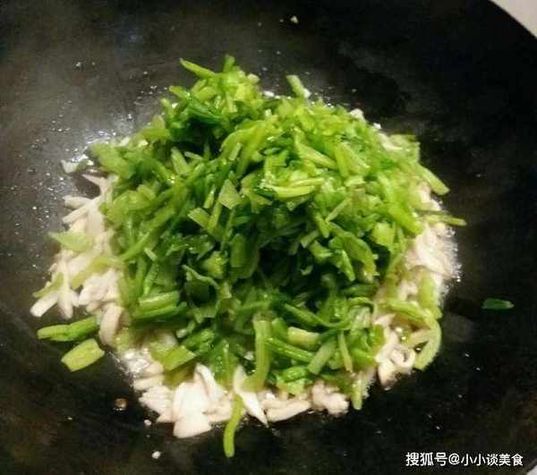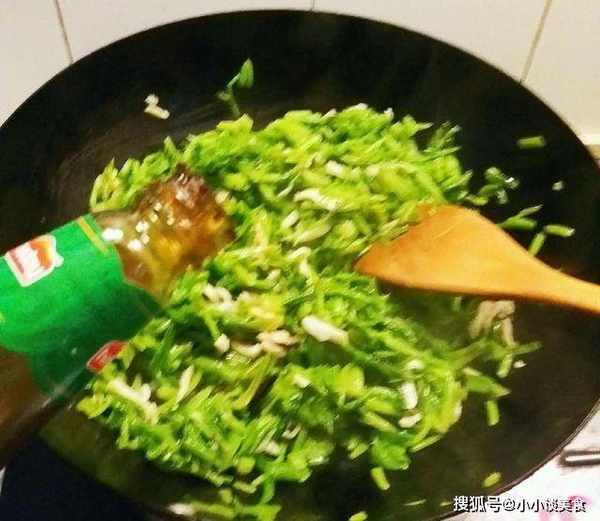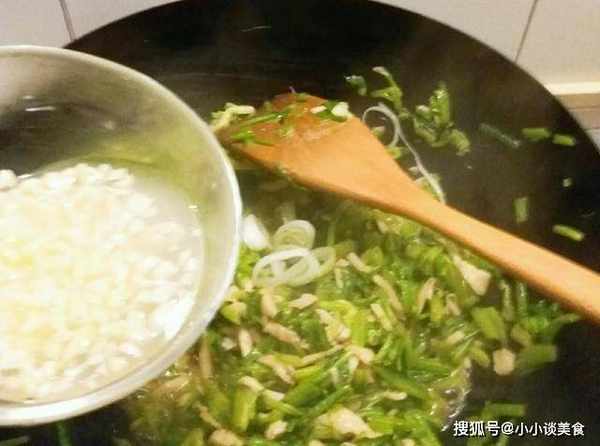 7、材料煮熟後,倒入準備好的蒜末水,快速翻炒均勻。湯會越來越稀。然後加入幾滴香油,可以提味。和清爽的效果。