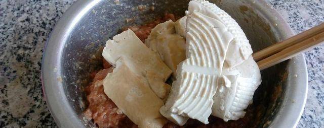 4.將豆腐拌勻,放入肉餡中。