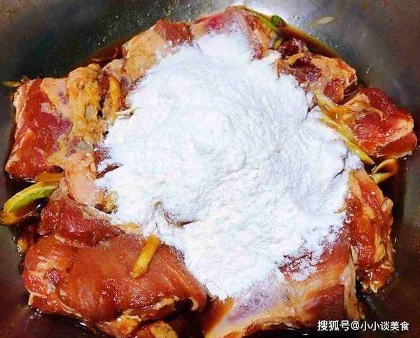 6.將面粉均勻的搟在排骨上,薄薄的一層
