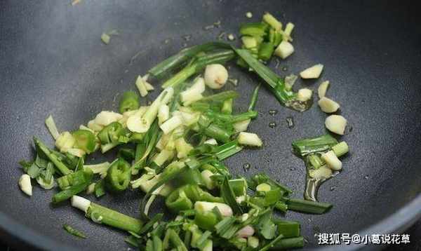 4、鍋裡放油,放入薑、蒜和辣椒,翻炒幾下,放入蒜苗。