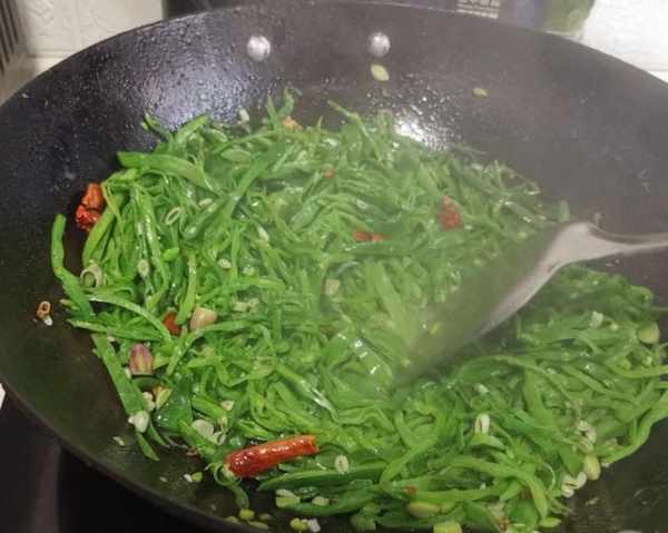 煸出香味後,倒入切好的扁豆絲大火煸炒。