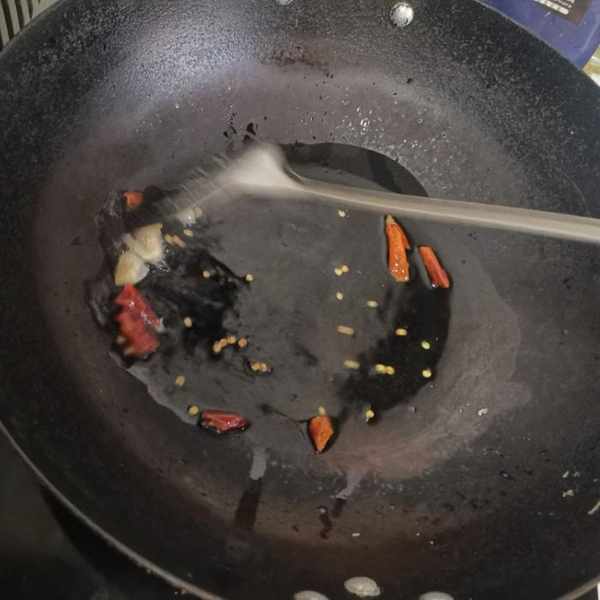 鍋裏加入花生油,放入蒜片和紅辣椒煸炒均勻,不吃辣也可以不用放辣椒。