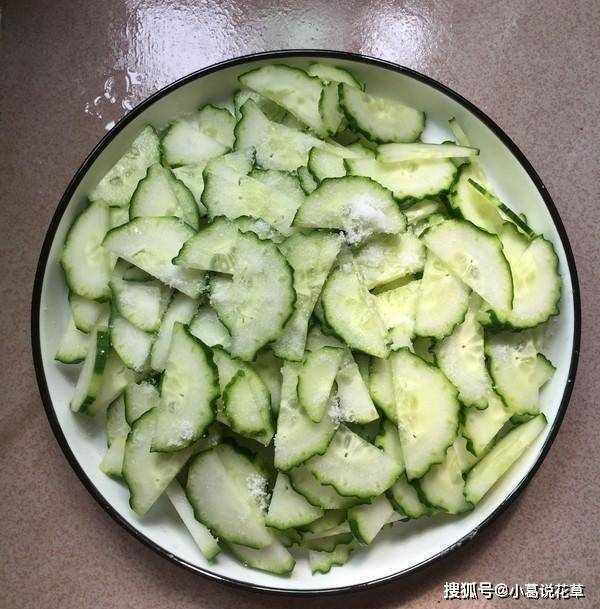 2、黃瓜洗凈,均勻切成薄片,撒上精鹽,拌勻醃5分鐘。