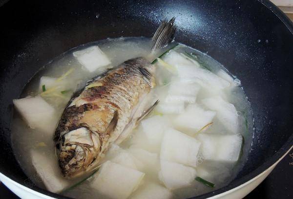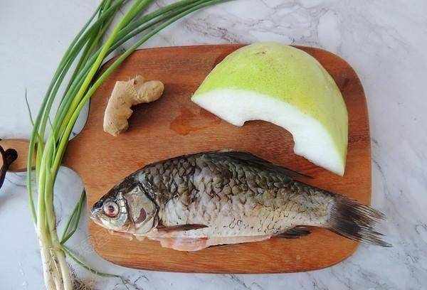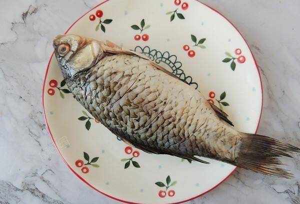 野生鯽魚1條、蠟1條、大蔥1條、花生油1茶匙、精鹽1茶匙、白胡椒粉1茶匙、料酒1湯匙、薑1片
