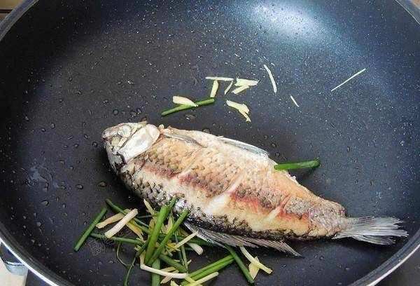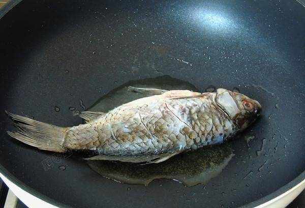 4、不粘鍋燒熱,加入適量食用油,待油熱後,用廚房紙巾將鯽魚表面吸幹,然後放入鍋中。