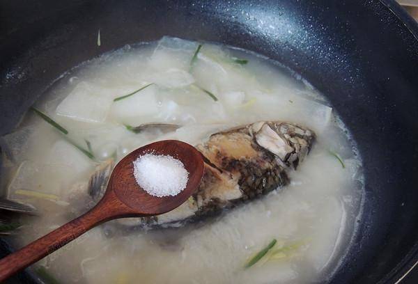 10、蠟煮至透明後,鍋中加入適量的鹽和白胡椒粉,拌勻後盛入碗中上桌。