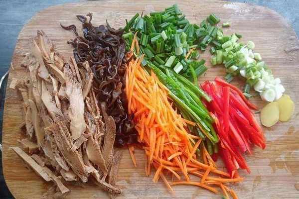 第四步:把所有的配件剪成條條狀,條狀備用。可以用胡蘿卜刨絲器,方便快捷。不吃薑片就切成大片,能吃就磨碎剁碎。