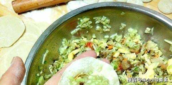 6、取出面團,揉好面筋,鋪上餃子皮,中間放上餡料。