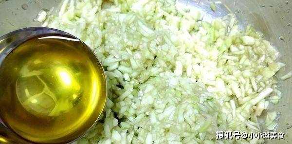 3、絲瓜切碎用水擠幹,放入餃子餡碗中。先倒入堅果油,攪拌均勻。這也是絲瓜減少水分的一個小方法。