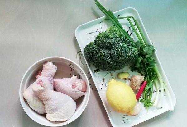 雞大腿3隻,小西蘭花1個,檸檬1個,胡椒1個,香菜1個,薑1小塊,蔥2根,料酒1湯匙,生抽1湯匙,蒜頭1瓣,精鹽適量,橄欖油適量