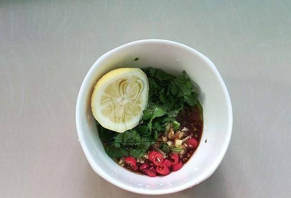 5、調泰式醬料:辣椒碎、蒜末、薑切末香菜碎一起放入碗中,倒入生抽,半個檸檬榨汁,加少許鹽和橄欖油拌勻