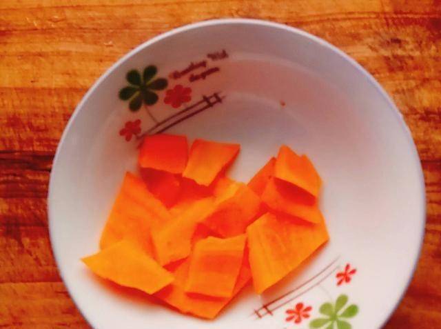 3.胡蘿卜切塊,用開水焯一下,撈出