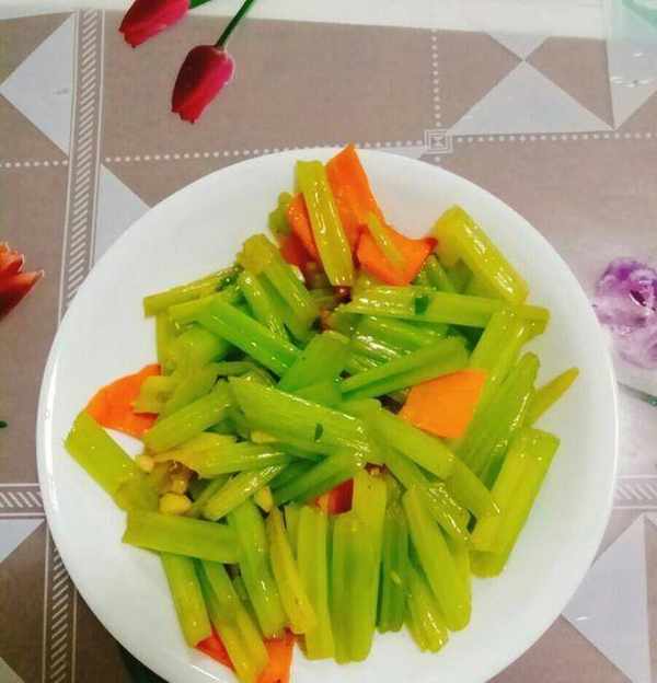 芹菜300克、胡蘿卜1根、蔥1根、大蒜2粒、大豆色拉油15克、精鹽1克、醬油少許