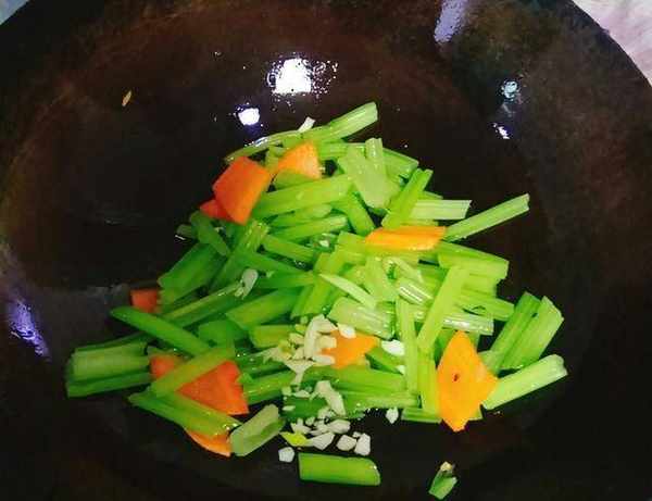 6.加入芹菜、生抽、鹽和蒜炒熟